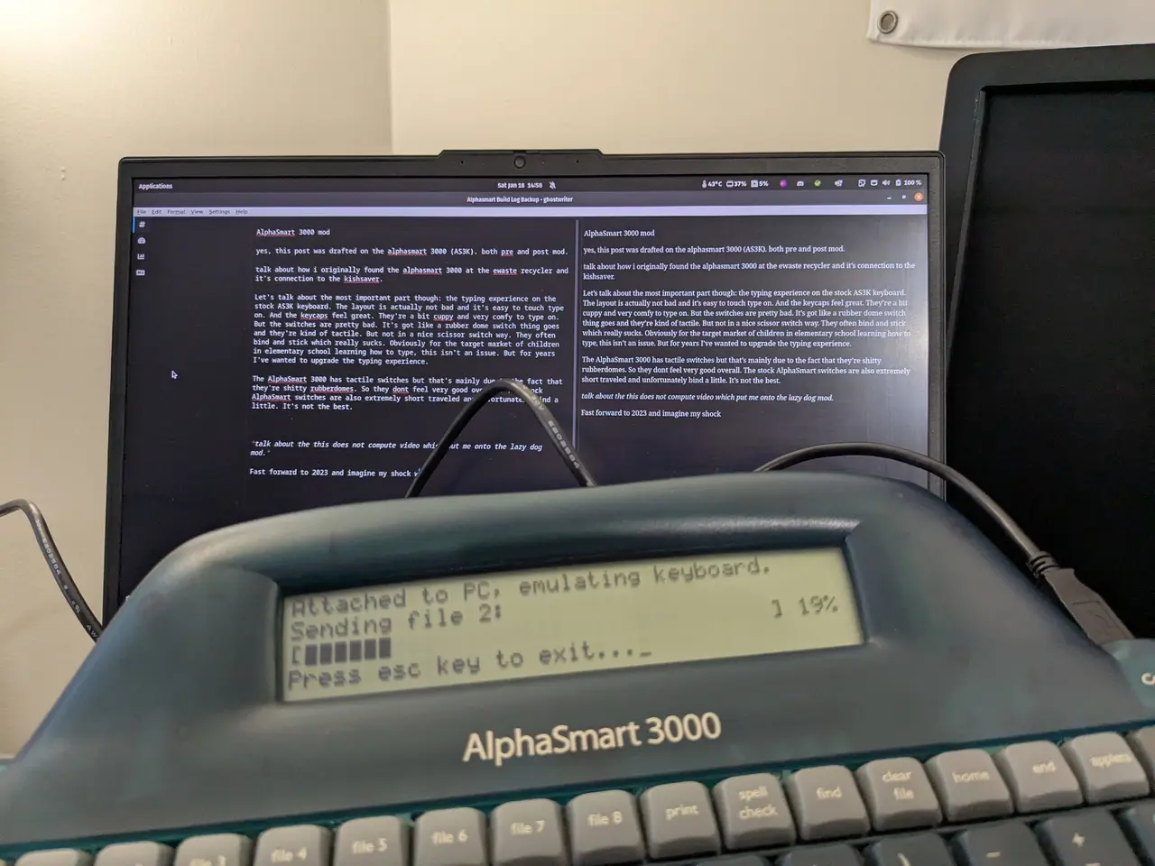 A fun thing you can do is that once you finish typing out your novel or whatever, it could be connected to any USB computer via it's USB port. But it doesn't transfer a Word or text file, it sends one word at a time into anything you can type in! Below is an example of my transferring a draft of this build log from the A3K to my computer via the USB port.