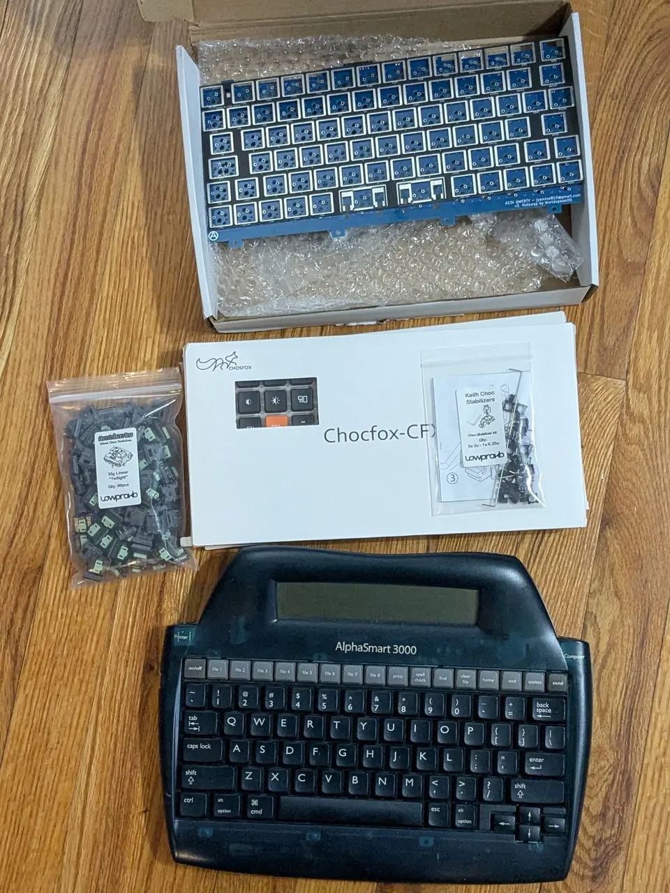 Fast forward to 2023, and imagine my shock when tech YouTuber This Does Not Computer did a retrospective video on the AlphaSmart series. That's how I found the Lazy Dog mechanical keyboard mod. I was planning to order the PCBs off their website and figure out how to mount the switches but ran into a few issues. First, Reddit posts said that the PCB files provided had some issues and that minor tweaks were needed, but I didn't know what those fixes were. Second, I'd be stuck with a very weird layout, and the MX switches stuck up very obviously. The mod and project are so cool but looked kinda janky. So, I kinda forgot about it for a while, like a year. I'm not sure why, but one day I was looking at the device again and decided to poke around to see if there were any developments. I had been casually looking for months for something I could work on writing projects on while sitting on the couch. I almost bought a few other things and then remembered that the AS3K mechanical keyboard mod was a thing. This time I noticed someone on Reddit advertising that they'd be selling AS3K mod kits on Etsy. And the PCB could take MX as well as Choc V1s! Finally, I could upgrade this weird little device and I had an excuse to look at Choc switches again. I was leaning toward Chocs because the AlphaSmart has a very thin and flat profile, so having a Choc build seemed perfect.