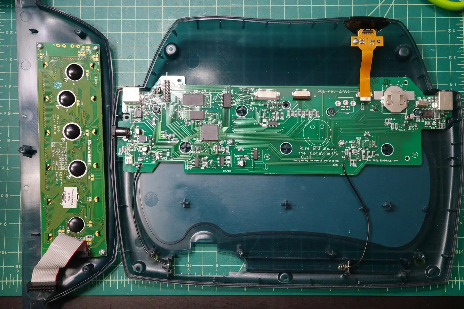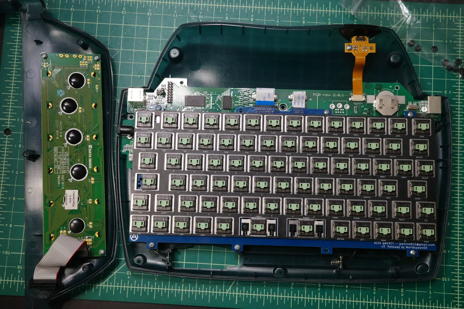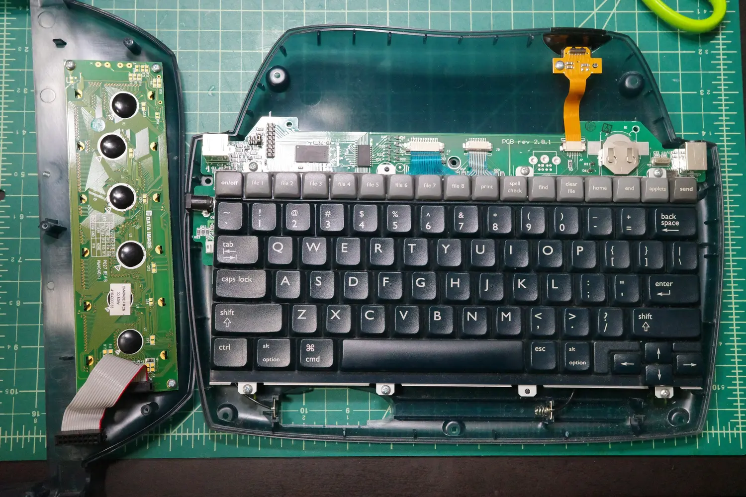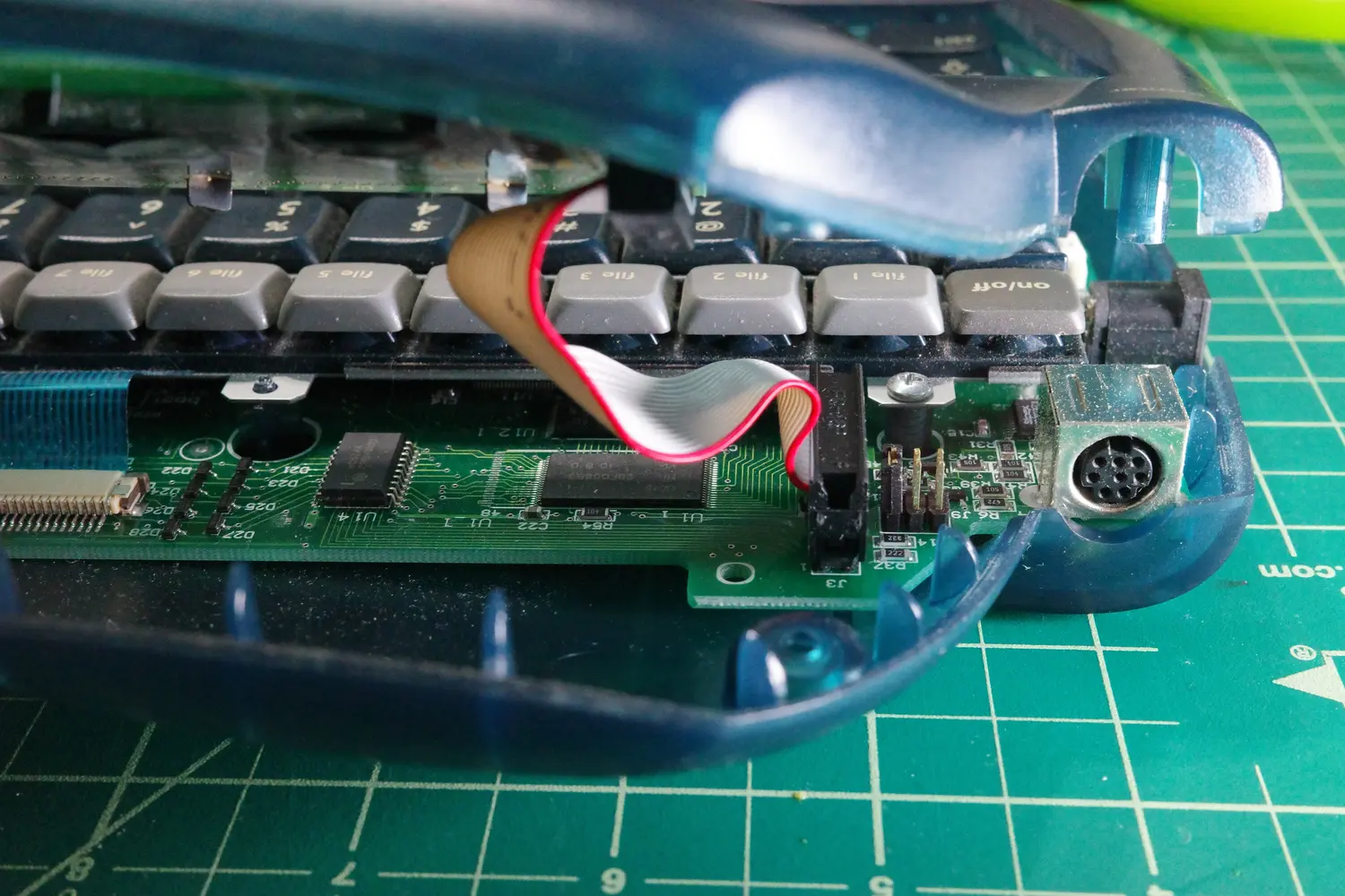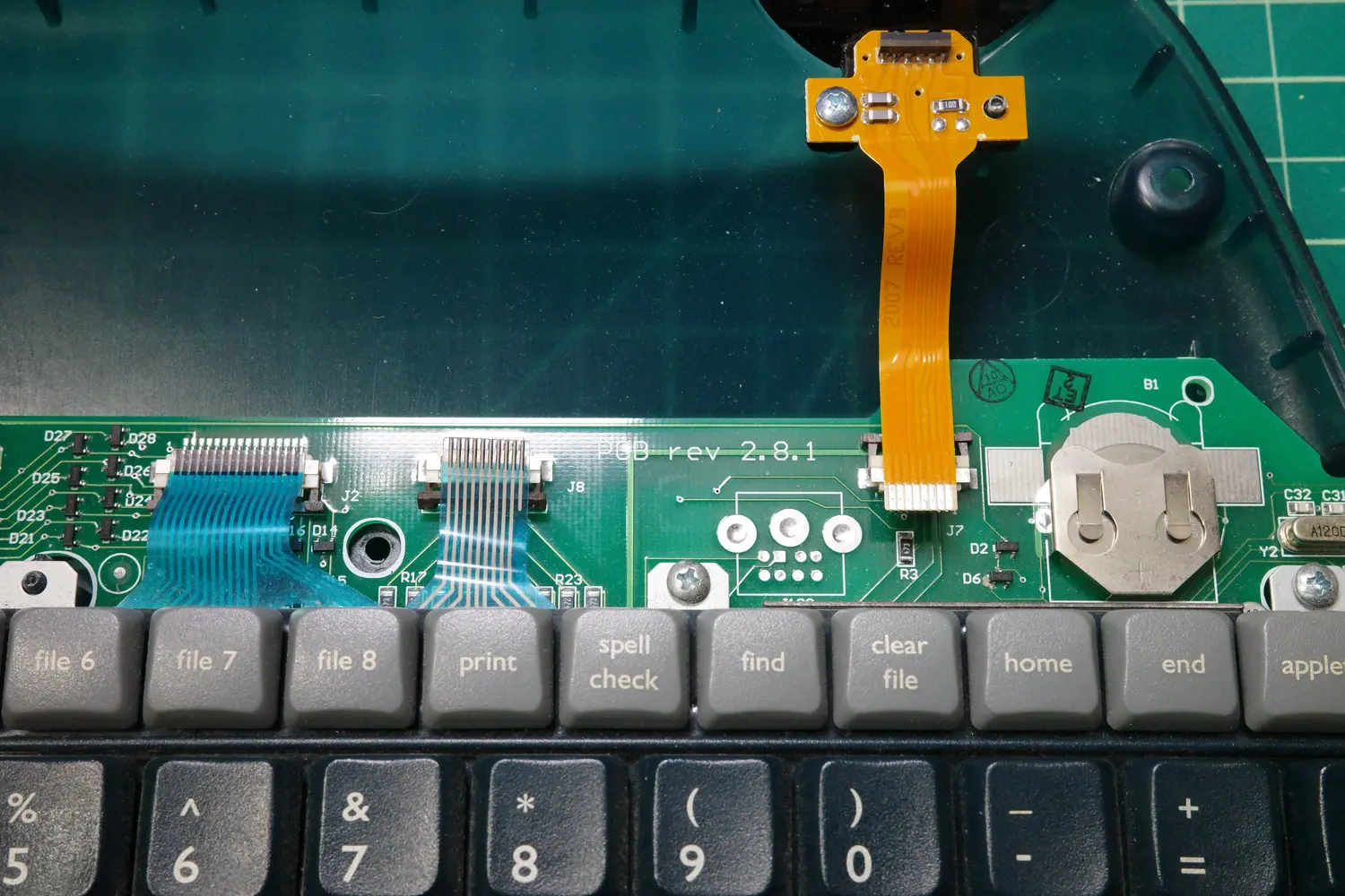 Now, the new assembly can be put into place. The kit came with two replacement ribbon cables, which connect the new mechanical keyboard assembly to the existing AlphaSmart PCB.